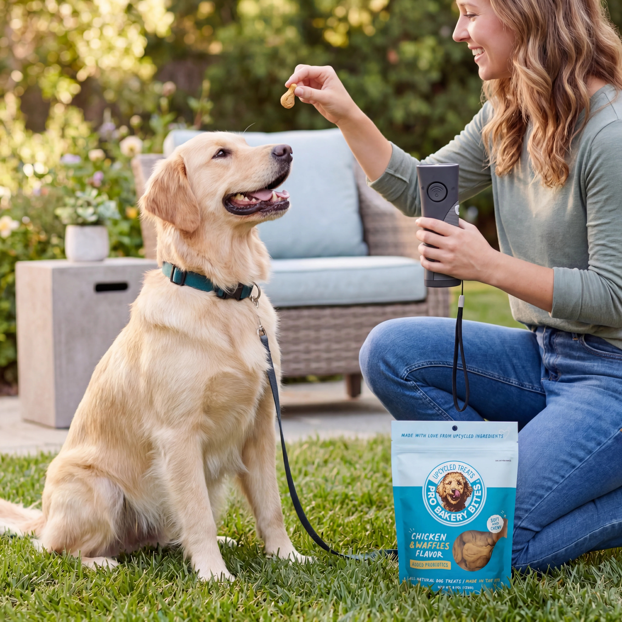 Pair Pro Bakery Bites with our OnGuard handheld ultrasonic bark deterrent device and save $5 on your first bag. Use OnGuard to interrupt barking, then reward calm behavior with our soft, probiotic treats.