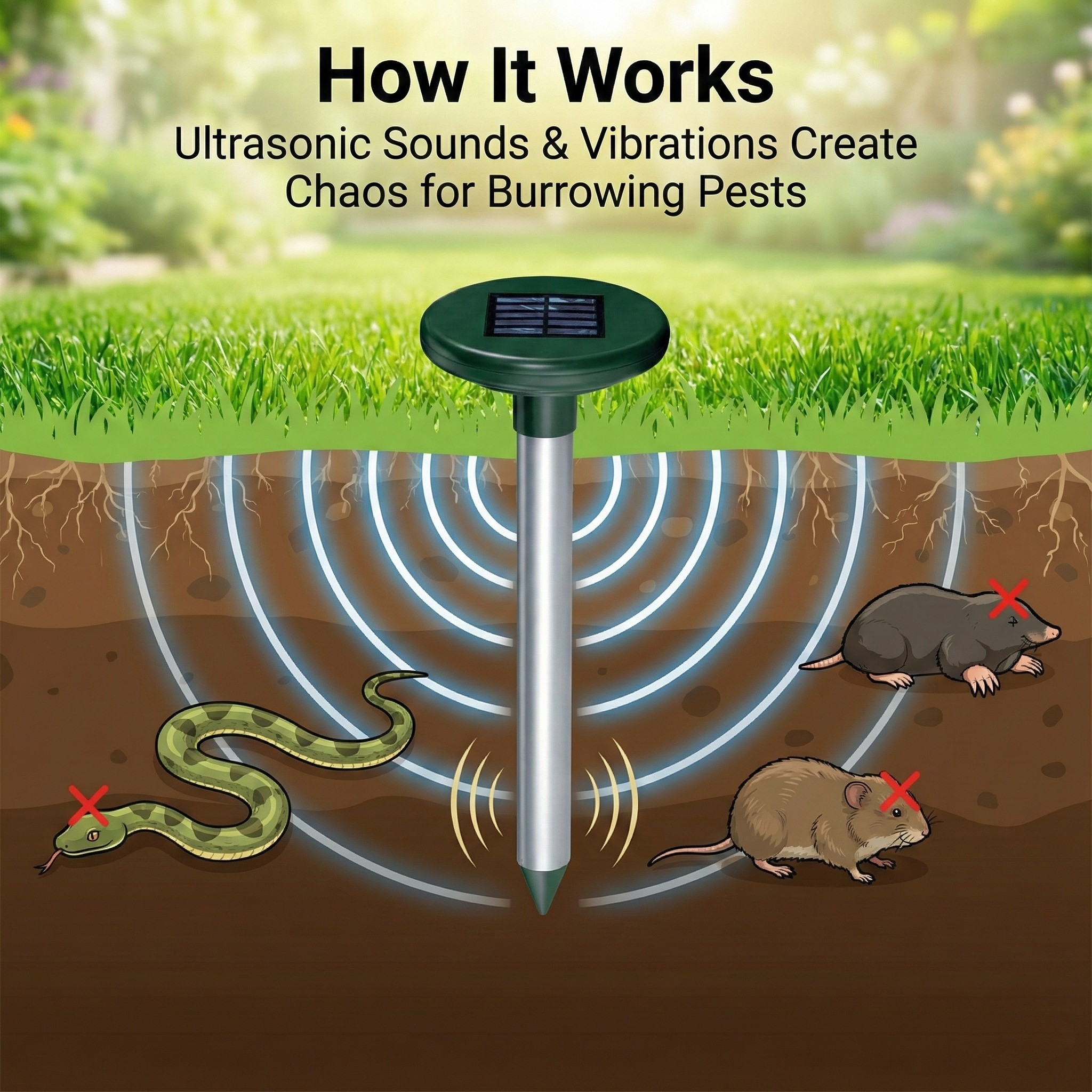 Tired of seeing snakes, moles, and other pest rodents in your yard? Ultrasonic sound and ground vibrations help keep them away without chemicals or traps.