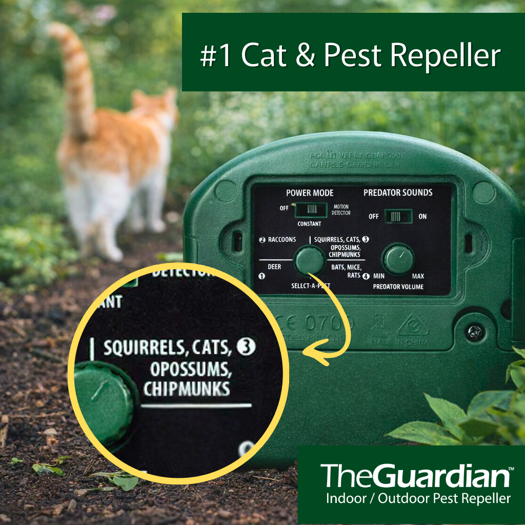 Turn the Select-a-Pest dial to Setting 3 for cats. The Guardian™ will automatically cycle through optimized sound patterns that target their hearing range.